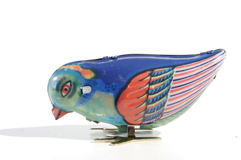 This is a wind-up lithographed tin blue bird that moves around while pecking the ground. Made in China. 7 cm. long. Supplied in colour box.
