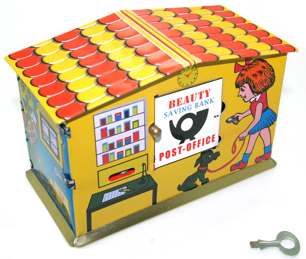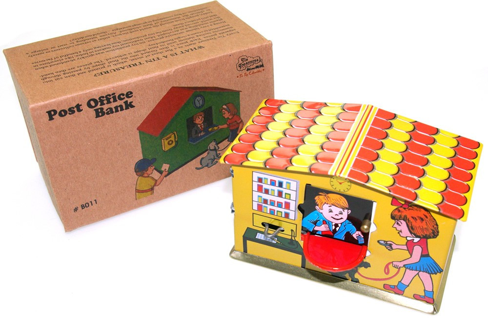 Slide the lever across the serving hatch and the postmaster appears at the window whilst the serving counter slides out of the front. Place a coin on the post office counter, press the button and the coin shoots into the building and the hatch closes up again. The coins can be retrieved from the underside using the key provided.