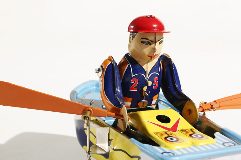 The boat moves with a realistic rocking motion due to the uneven wheels. While the man rows convincingly, pulling back at ech stroke. Clockwork, Made in China, 12cm